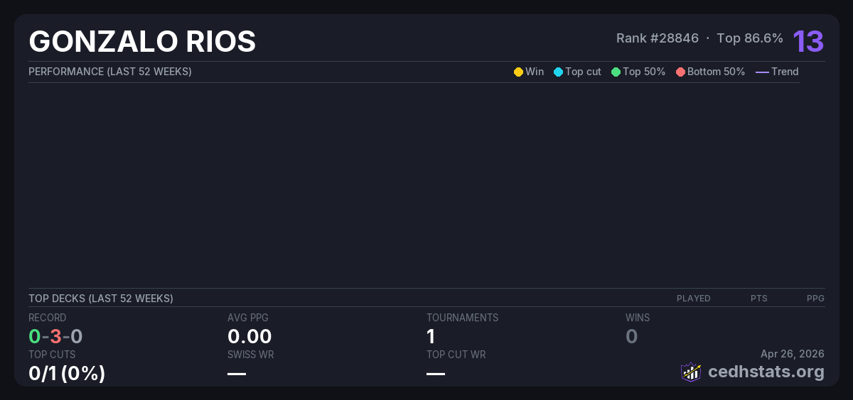 | CEDH HAMMER NOCTURNO Oct 18, 2025 · 22 players | Invalid pairing | 18/22 | 0-3-0 | 0.00 | 13 |
