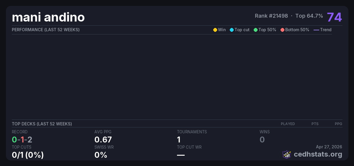 | Cole Ellinwood's Bye Bye Party Apr 25, 2026 · 22 players | — | 14/22 | 0-1-2 | 0.67 | 74 |