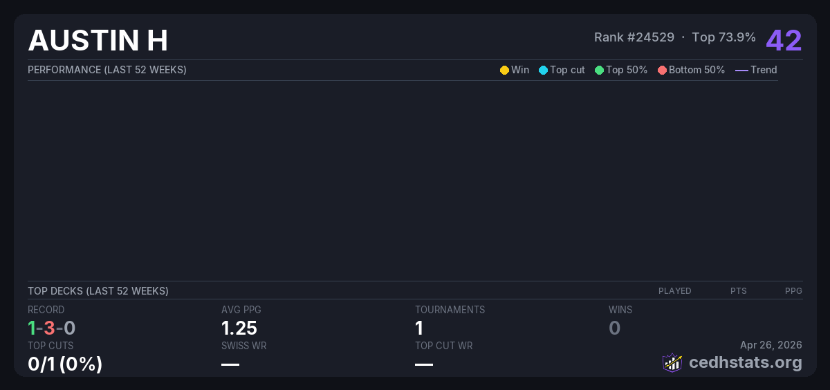 | CEDH SATURDAY Jul 12, 2025 | Invalid pairing | 10/16 | 1-3-0 | 42 |