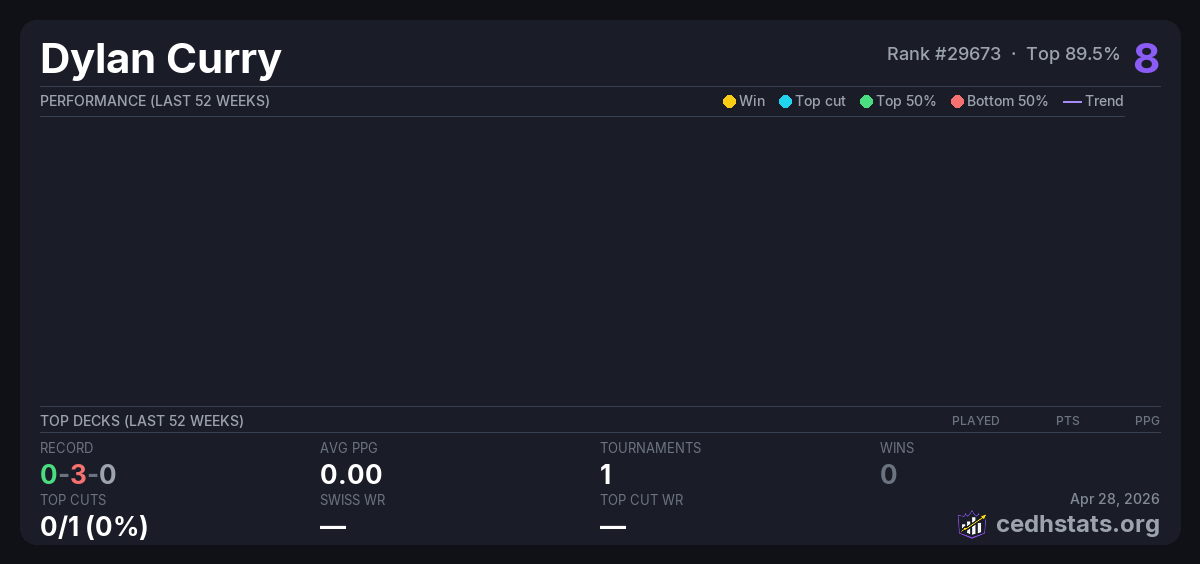 | Commander Championship Aug 09, 2025 | Invalid pairing | 19/22 | 0-3-0 | 8 |