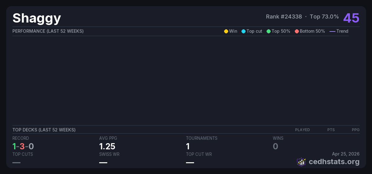 | Ludik edh Aug 31, 2025 · 20 players | Invalid pairing | 11/20 | 1-3-0 | 1.25 | 45 |