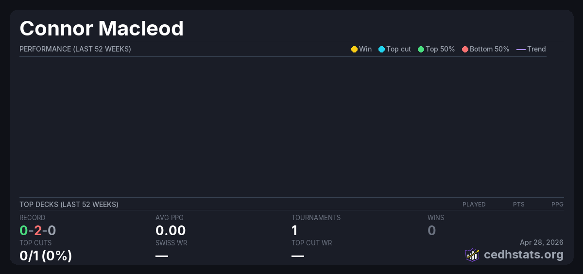 | End of the year store championship Dec 13, 2025 · 19 players | 19/19 | 0-2-0 | 0.00 | — |