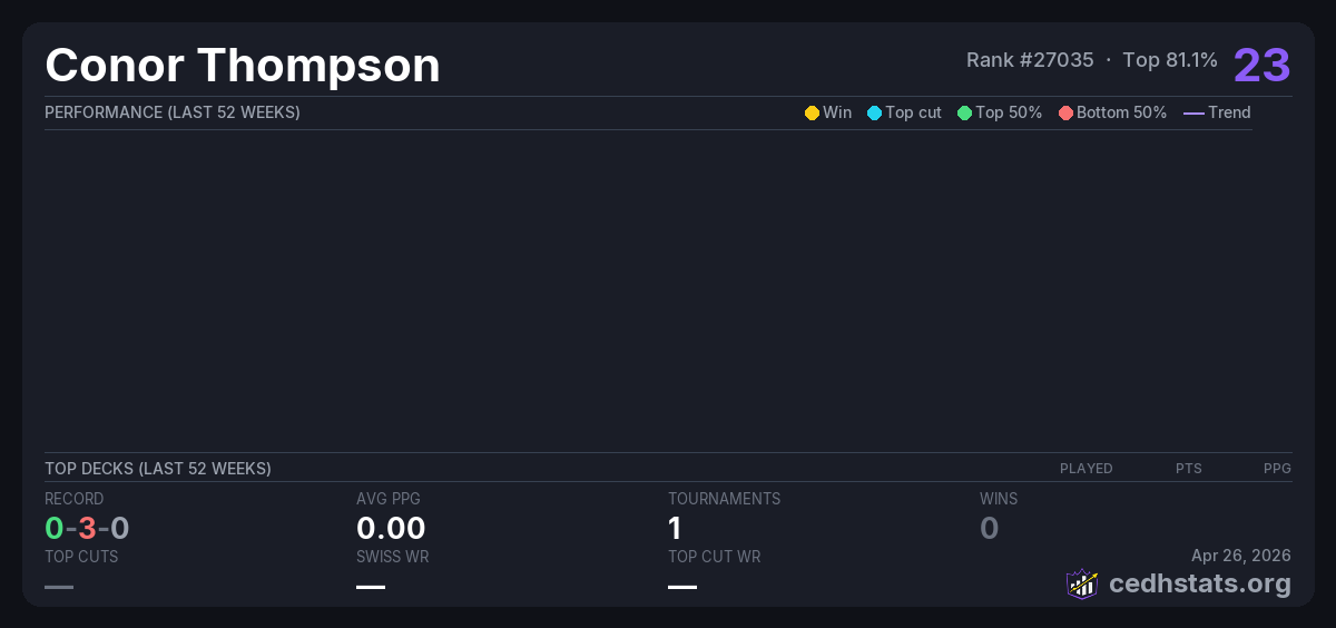 | W28V2EN - March 22 Commander Mar 22, 2026 · 21 players | 16/21 | 0-3-0 | 0.00 | 23 |