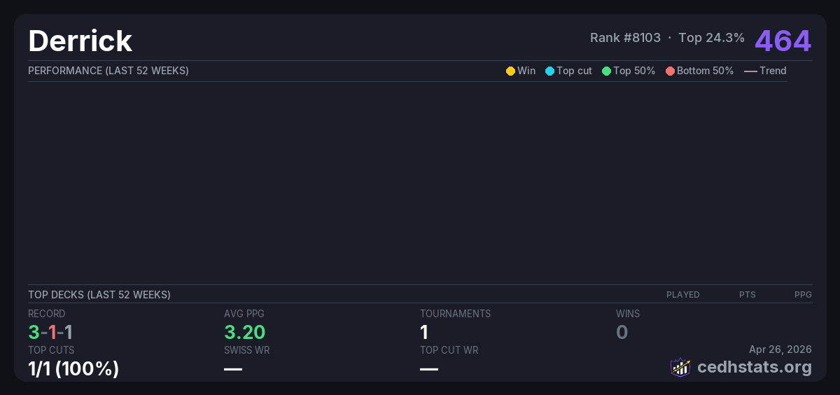 | CEDH Dec 21, 2025 · 21 players | 2/21 | 3-1-1 | 3.20 | 464 |