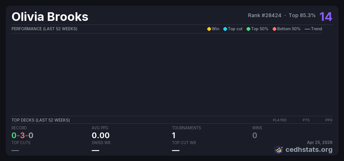 | test123 Sep 09, 2025 · 32 players | Invalid pairing | 26/32 | 0-3-0 | 0.00 | 14 |