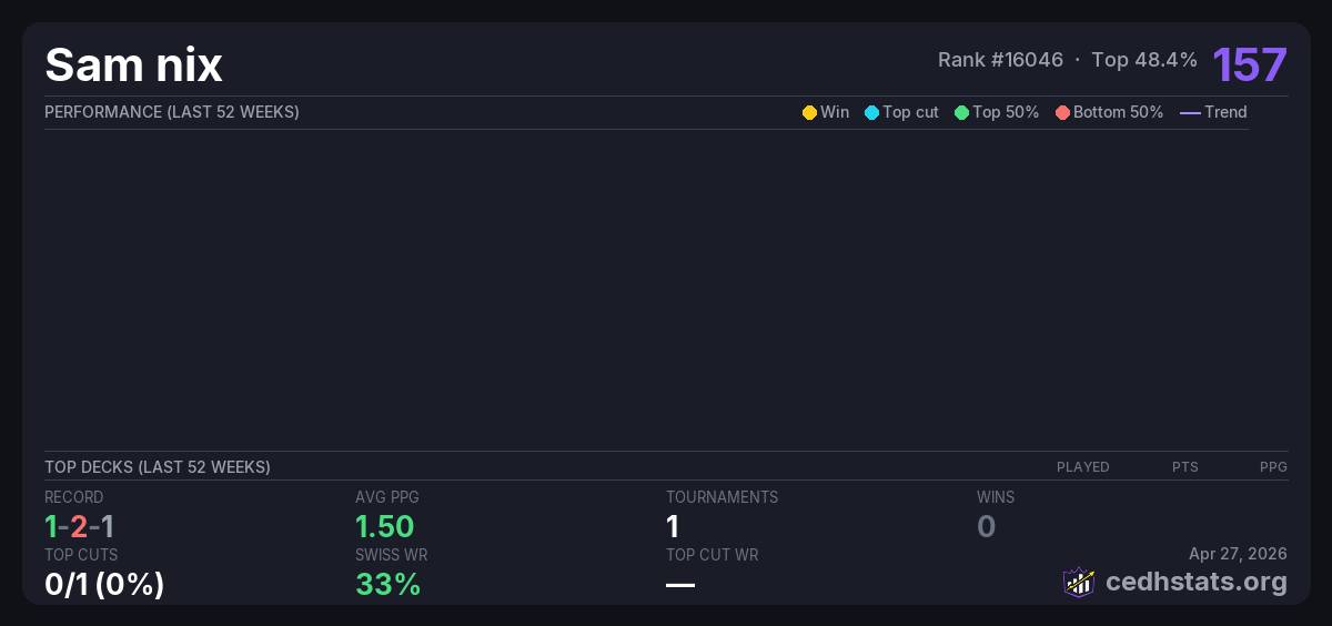 | SCRUBLAND | URZA'S DESTINY | STRIXHAVEN BOX | April CEDH Tournament Apr 25, 2026 · 27 players | — | 11/27 | 1-2-1 | 1.50 | 157 |