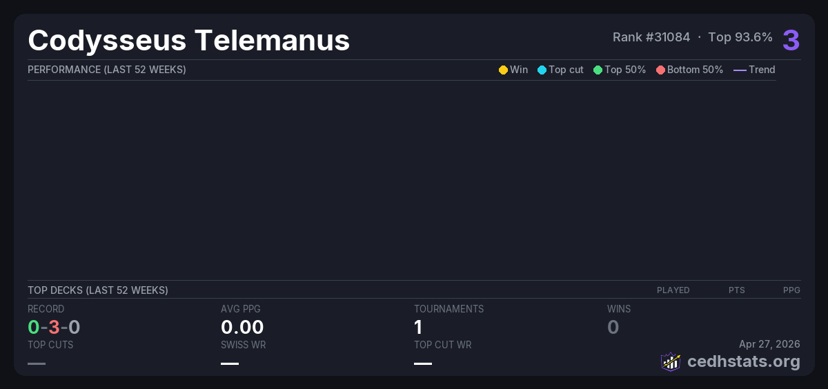 | FNM EDH 11-21-25 Nov 21, 2025 · 28 players | Invalid pairing | 26/28 | 0-3-0 | 0.00 | 3 |