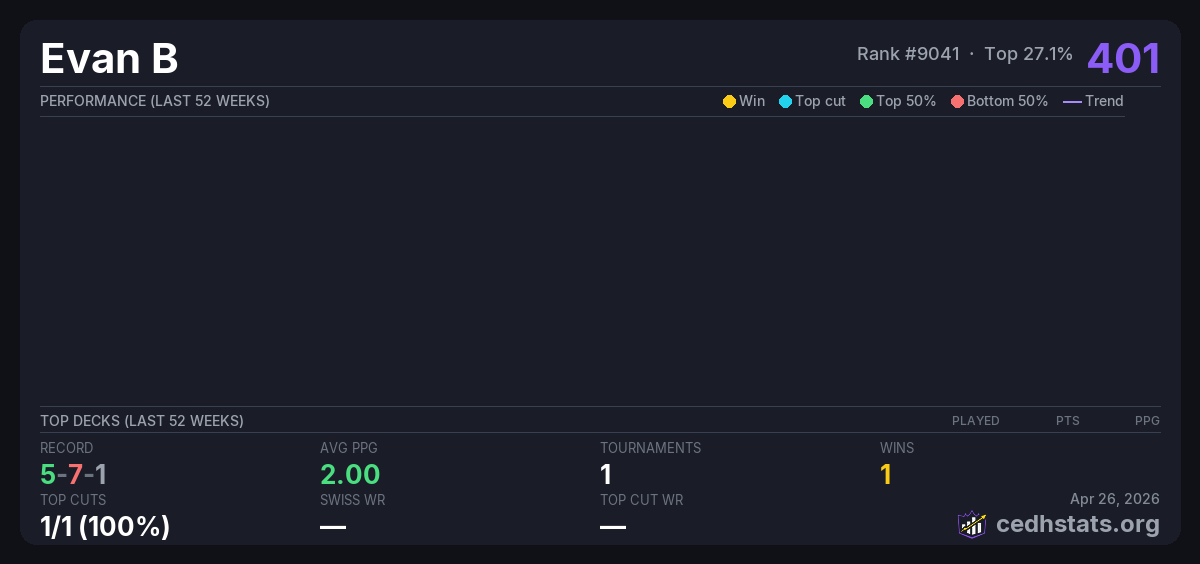 | The Iron Lion March CEDH League Mar 04, 2026 · 16 players | — | 1/16 | 5-7-1 | 2.00 | 401 |