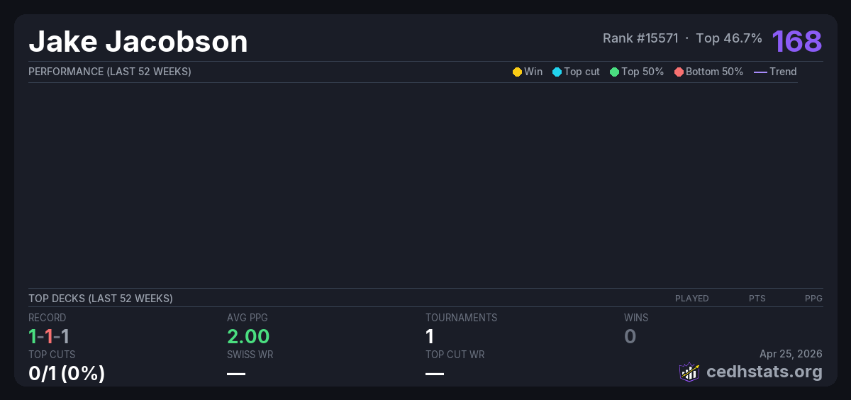 | Precon Night Sep 27, 2025 · 24 players | Invalid pairing | 5/24 | 1-1-1 | 2.00 | 168 |