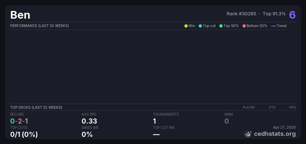 | Plot Armor PARC League CEDH Apr 26, 2026 · 20 players | — | 18/20 | 0-2-1 | 0.33 | 6 |