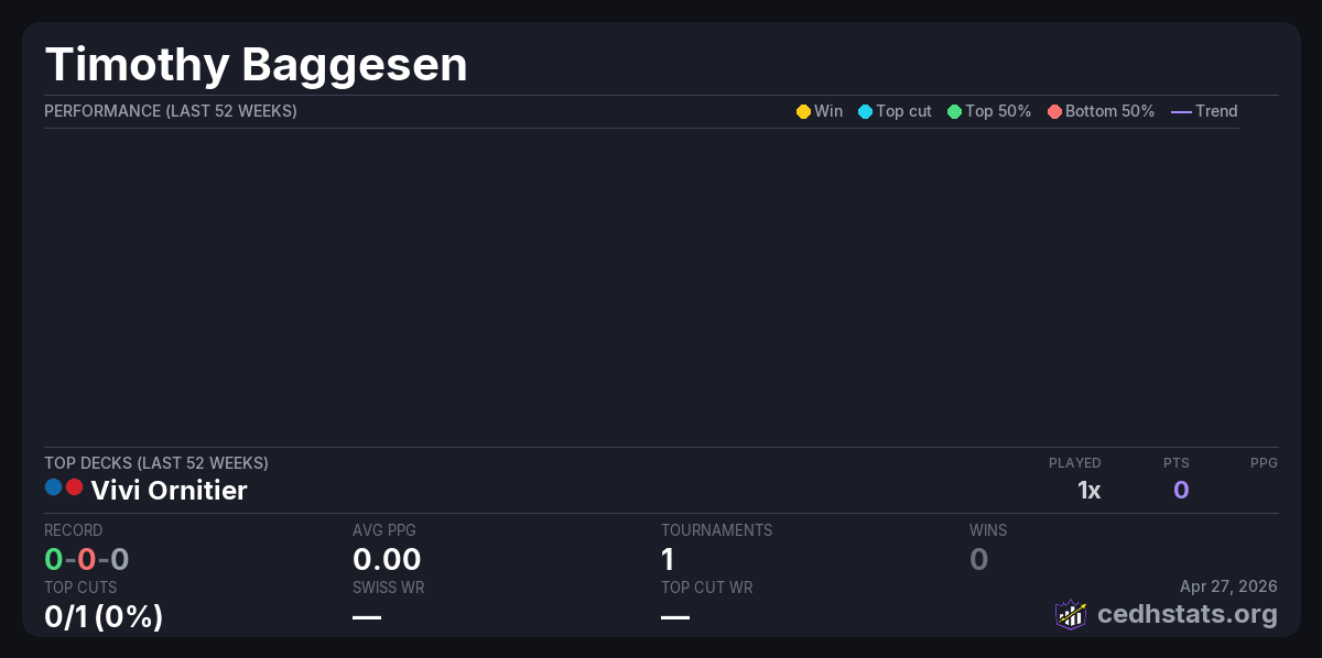 | Atlantic City TCG Show cEDH $1.5K Apr 25, 2026 · 61 players | Vivi Ornitier | 57/61 | 0-0-0 | 0.00 | — |