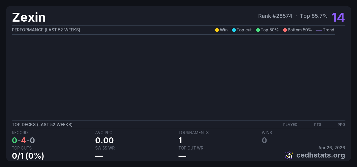| beijing kadou cedh 2.23 Feb 23, 2026 · 16 players | 13/16 | 0-4-0 | 0.00 | 14 |