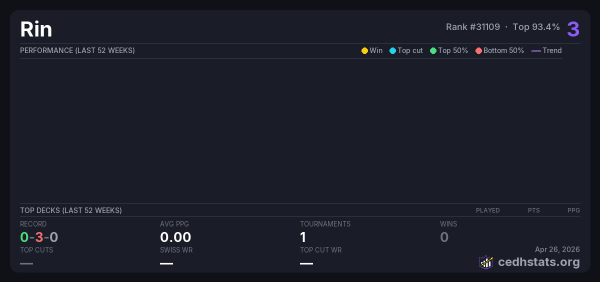| Commander Bracket 3 @Kosa, by Play Inside Jun 14, 2025 · 16 players | Invalid pairing | 15/16 | 0-3-0 | 0.00 | 3 |