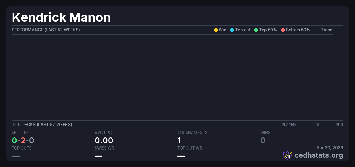 | Weekly Monday cEDH Jun 16, 2025 · 16 players | Invalid pairing | 10/16 | 0-2-0 | 0.00 | — |