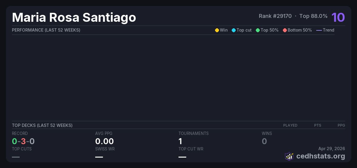 | Bracket 3 Tournamnet at High Market Apr 28, 2026 · 16 players | — | 13/16 | 0-3-0 | 0.00 | 10 |