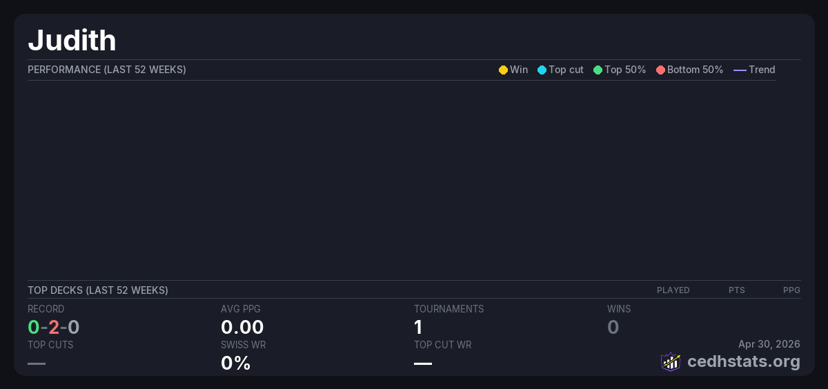 | MTG: Commander Budget (Bracket 2) Apr 30, 2026 · 18 players | — | 12/18 | 0-2-0 | 0.00 | — |