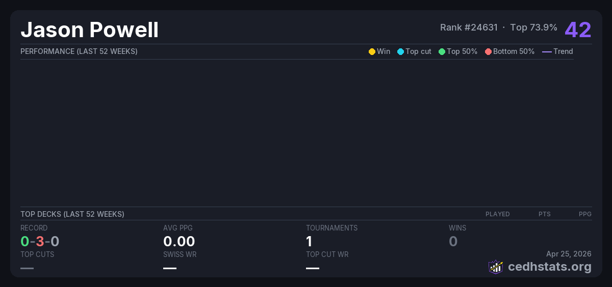 | Tournament | Deck | Result | Record | PPG | Points ? |