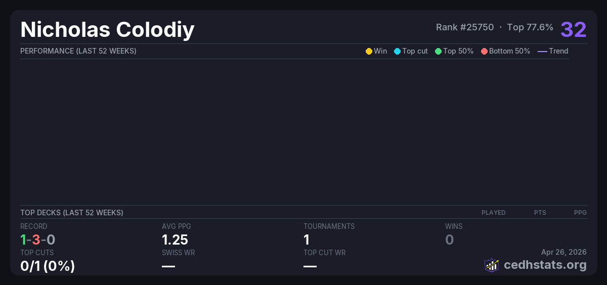 | 2025 September CEDH Sep 27, 2025 · 16 players | Invalid pairing | 11/16 | 1-3-0 | 1.25 | 32 |
