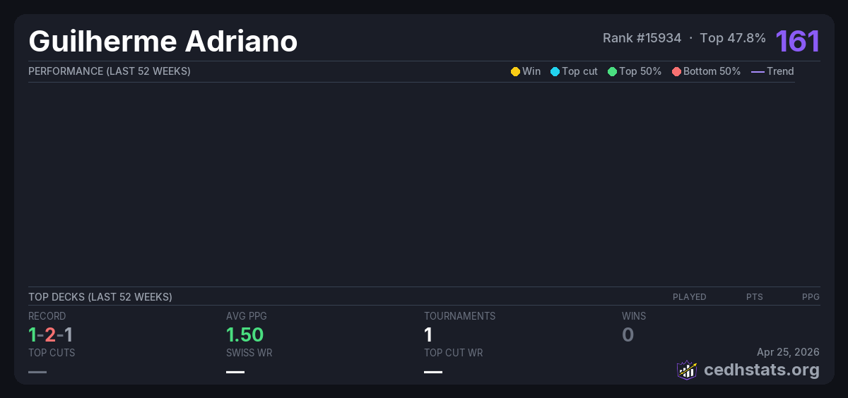 | Casa de Ruter CEDH Janeiro 2026 Jan 24, 2026 · 28 players | 8/28 | 1-2-1 | 1.50 | 160 |