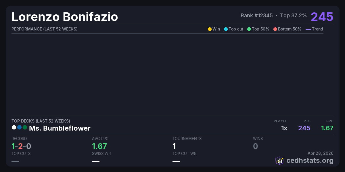 | Lega Commander - Bracket 3 - Tappa 2 Apr 26, 2026 · 23 players | Ms. Bumbleflower | 4/23 | 1-2-0 | 1.67 | 245 |