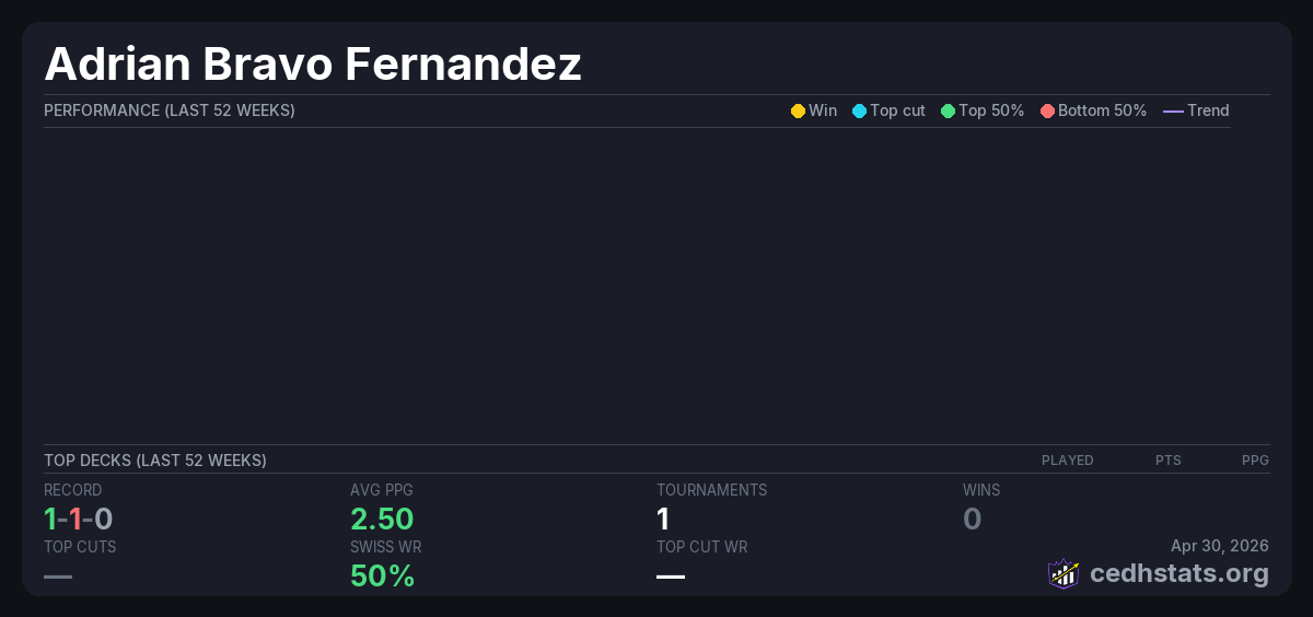| MTG: Commander Budget (Bracket 2) Apr 30, 2026 · 18 players | — | 4/18 | 1-1-0 | 2.50 | — |