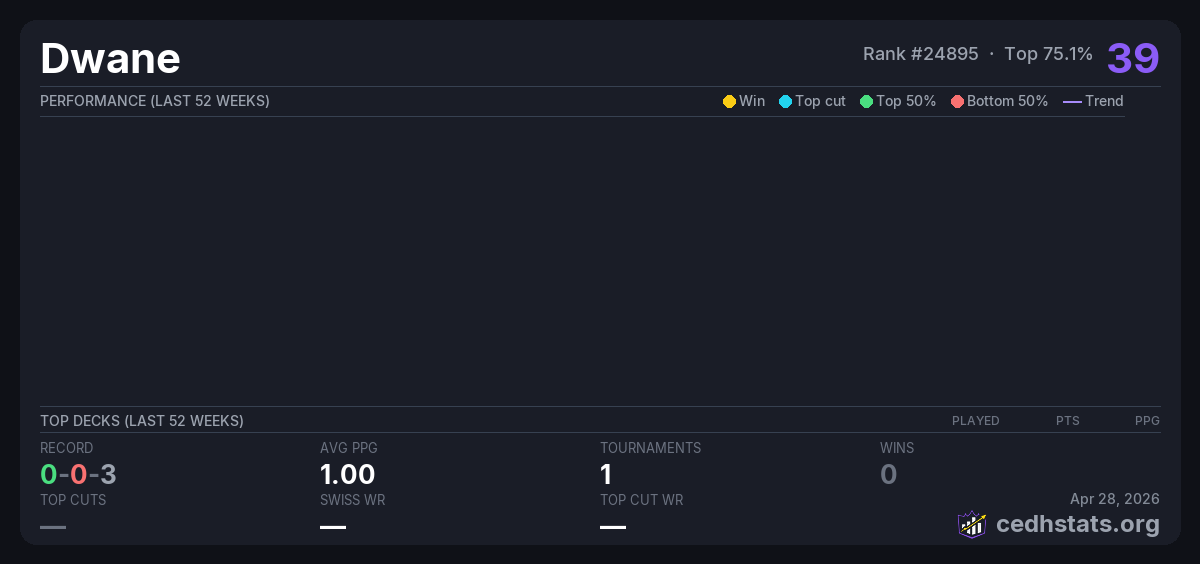 | Commander Precon League 2 Week 3 Aug 30, 2025 | Invalid pairing | 19/28 | 0-0-3 | 39 |