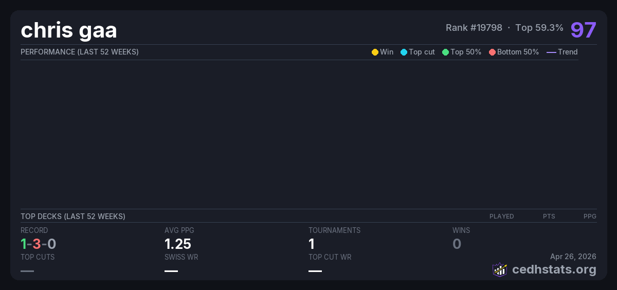 | 125 Budget Commander - May 17 May 17, 2025 · 18 players | Invalid pairing | 8/18 | 1-3-0 | 1.25 | 97 |