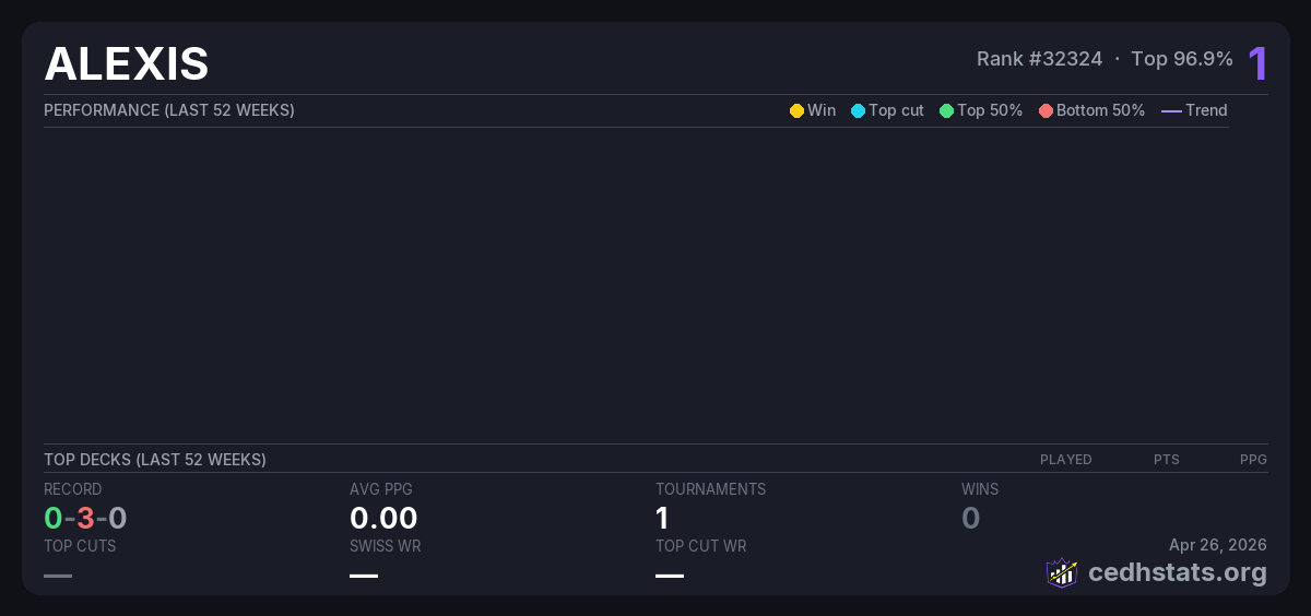 | BABY COMMANDER Oct 06, 2025 · 16 players | Invalid pairing | 16/16 | 0-3-0 | 0.00 | 1 |