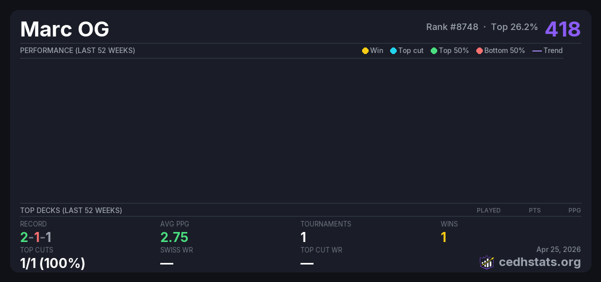 | April Qualifier Mar 16, 2026 · 20 players | 1/20 | 2-1-1 | 2.75 | 418 |