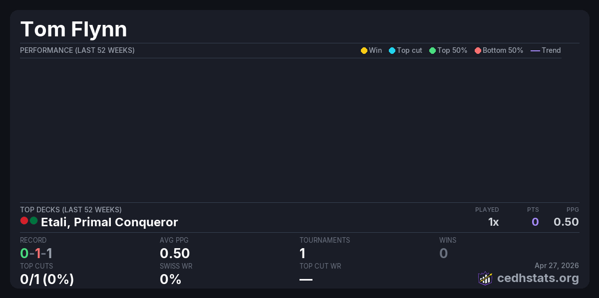 | Bondi Fetch Bonanza Apr 26, 2026 · 17 players | Etali, Primal Conqueror // Etali, Primal Sickness | 6/17 | 0-1-1 | 0.50 | — |