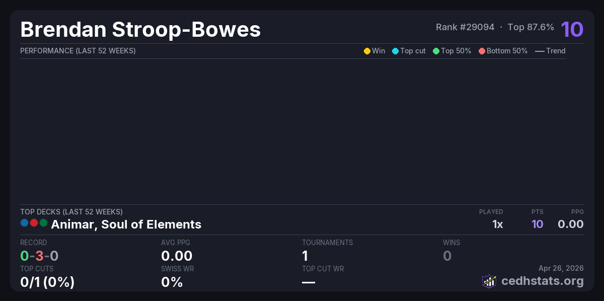 | Waypoint cEDH Summit Series 3 Apr 25, 2026 · 16 players | Animar, Soul of Elements | 14/16 | 0-3-0 | 0.00 | 10 |