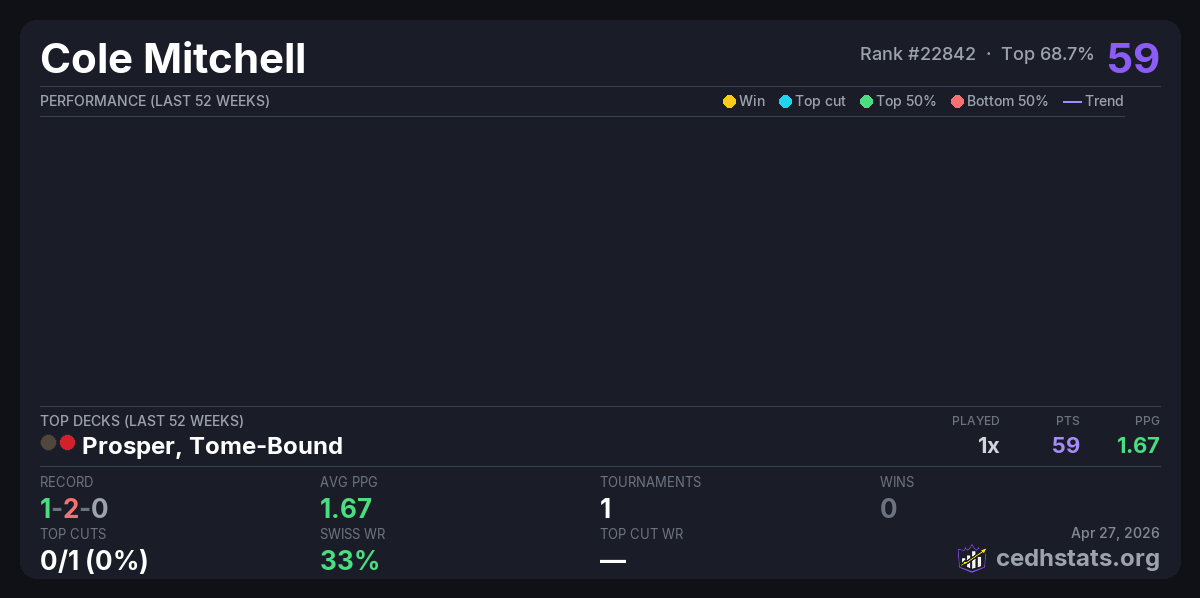 | Battlegrounds cEDH Monthly Apr 25, 2026 | Prosper, Tome-Bound | 19/30 | 1-2-0 | 59 |