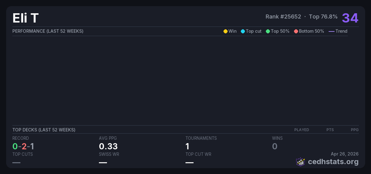 | Commander League week 1 Jan 31, 2026 · 19 players | 13/19 | 0-2-1 | 0.33 | 34 |