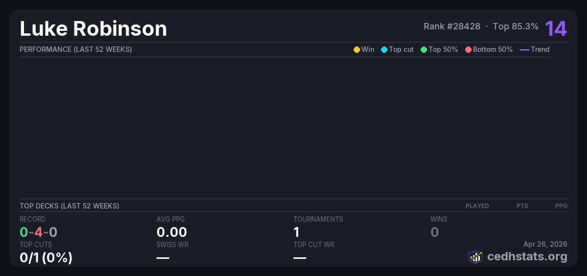 | CEDH Oct 05, 2025 | Invalid pairing | 17/21 | 0-4-0 | 14 |