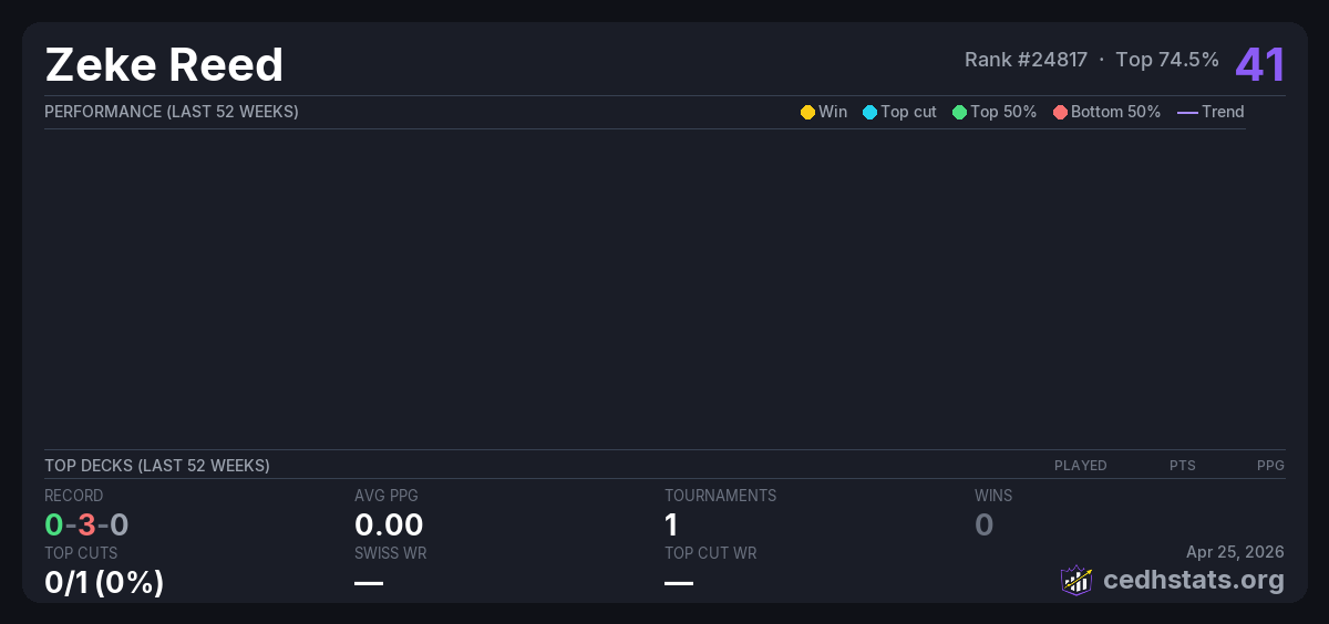 | Anti cedh Cardsurfer Games Jan 11, 2026 | 21/32 | 0-3-0 | 41 | |