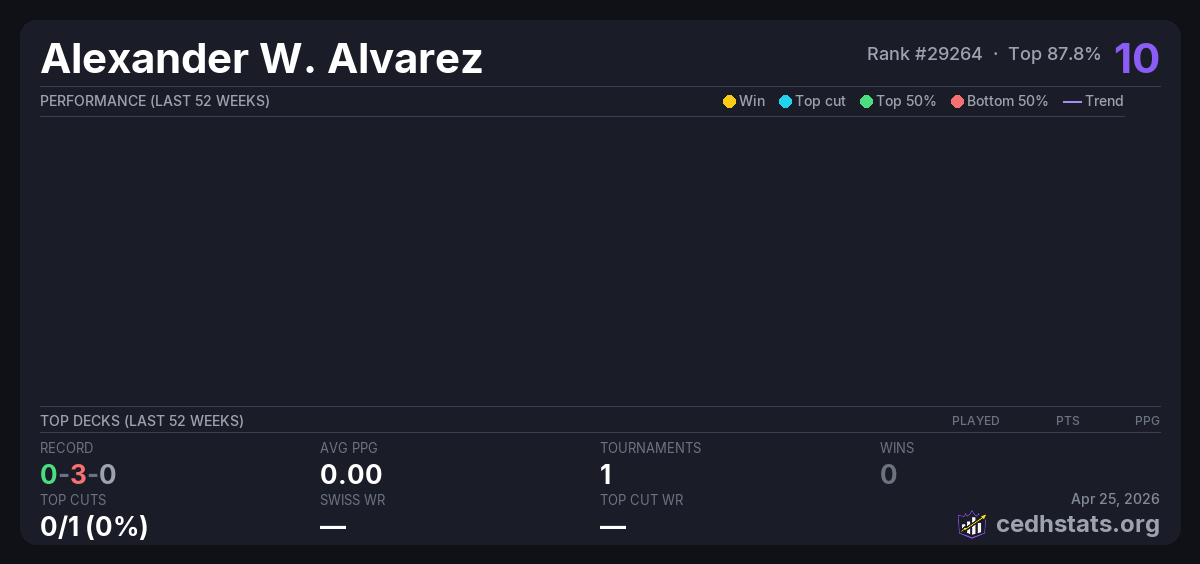 | Anti cedh Cardsurfer Games Jan 11, 2026 | 27/32 | 0-3-0 | 10 | |