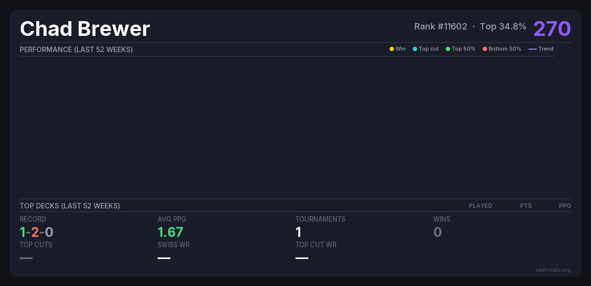| Bracket 3 Mar 29, 2026 · 22 players | 4/22 | 1-2-0 | 1.67 | 270 |