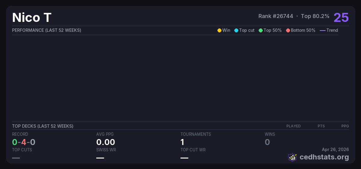 | Torneo 21/9 Sep 21, 2025 | Invalid pairing | 10/16 | 0-4-0 | 25 |