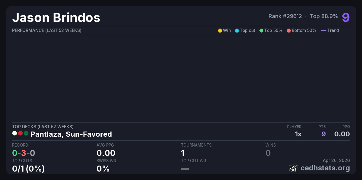 | TGL April Bracket 4 Tournament Apr 25, 2026 · 18 players | Pantlaza, Sun-Favored | 16/18 | 0-3-0 | 0.00 | 9 |