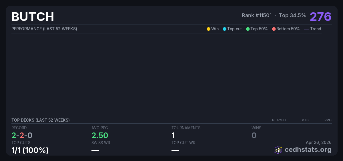 | Tournament | Deck | Result | Record | PPG | Points ? |