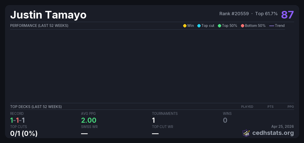 | Tournament | Deck | Result | Record | PPG | Points ? |