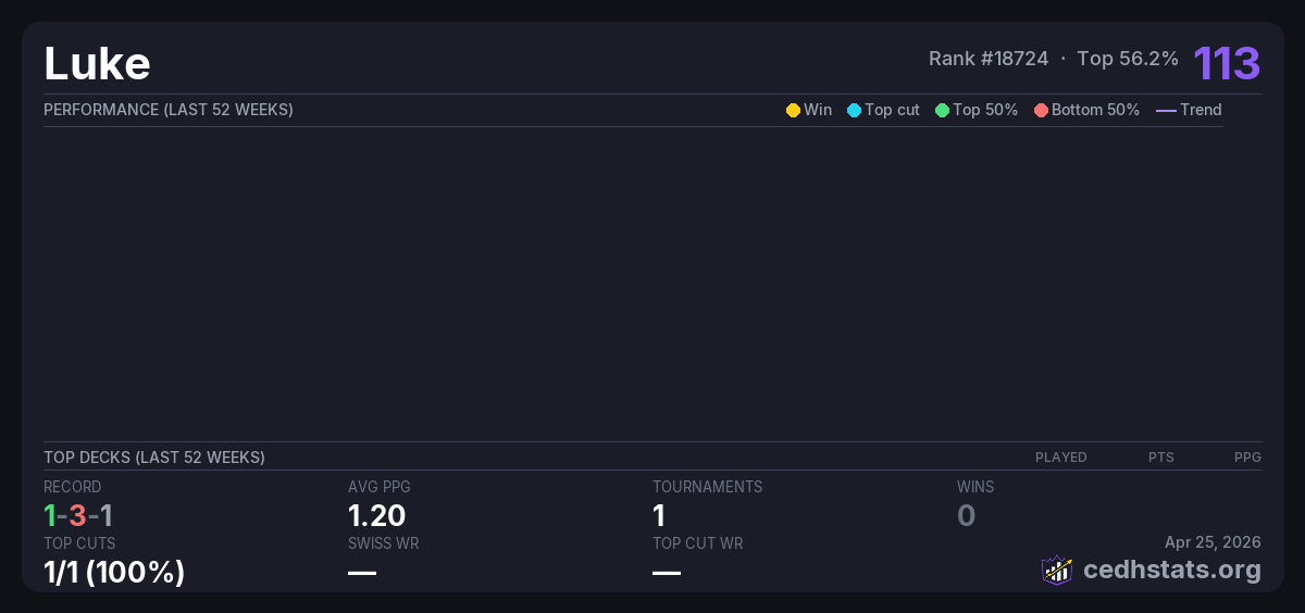 | CEDH Dec 21, 2025 · 21 players | 9/21 | 1-3-1 | 1.20 | 113 |