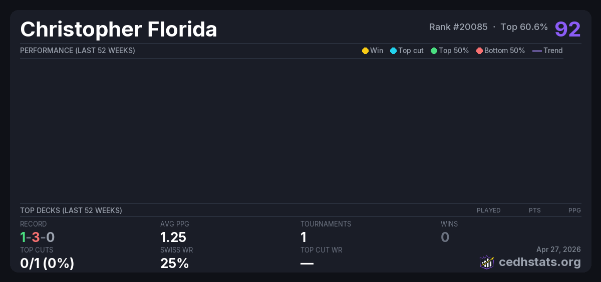 | SCRUBLAND | URZA'S DESTINY | STRIXHAVEN BOX | April CEDH Tournament Apr 25, 2026 · 27 players | — | 15/27 | 1-3-0 | 1.25 | 92 |