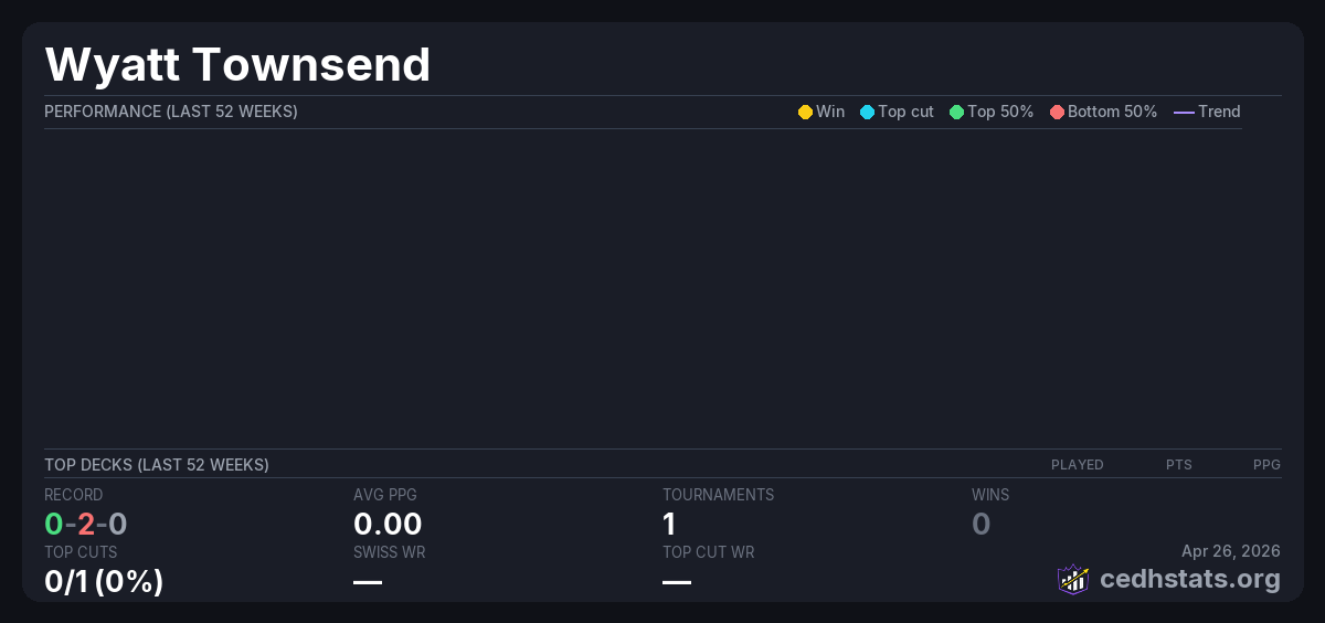 | Store Championship Nov 02, 2025 · 16 players | Invalid pairing | 8/16 | 0-2-0 | 0.00 | — |