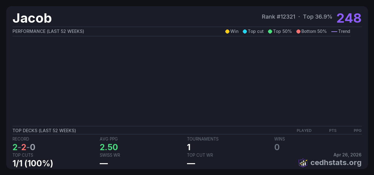 | IQ June Jun 28, 2025 · 20 players | Invalid pairing | 5/20 | 2-2-0 | 2.50 | 248 |