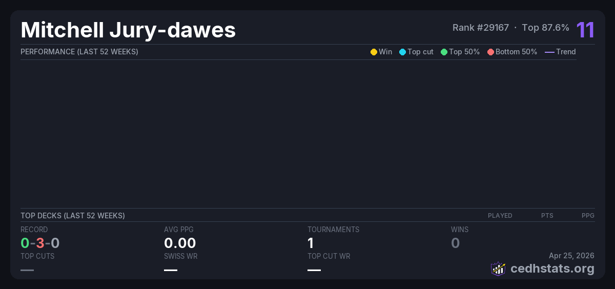 | Commander Wednesday Weekly Jan 14, 2026 · 44 players | 38/44 | 0-3-0 | 0.00 | 11 |