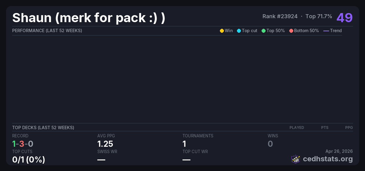 | Mono Color B3 Mar 22, 2026 · 18 players | 11/18 | 1-3-0 | 1.25 | 49 |