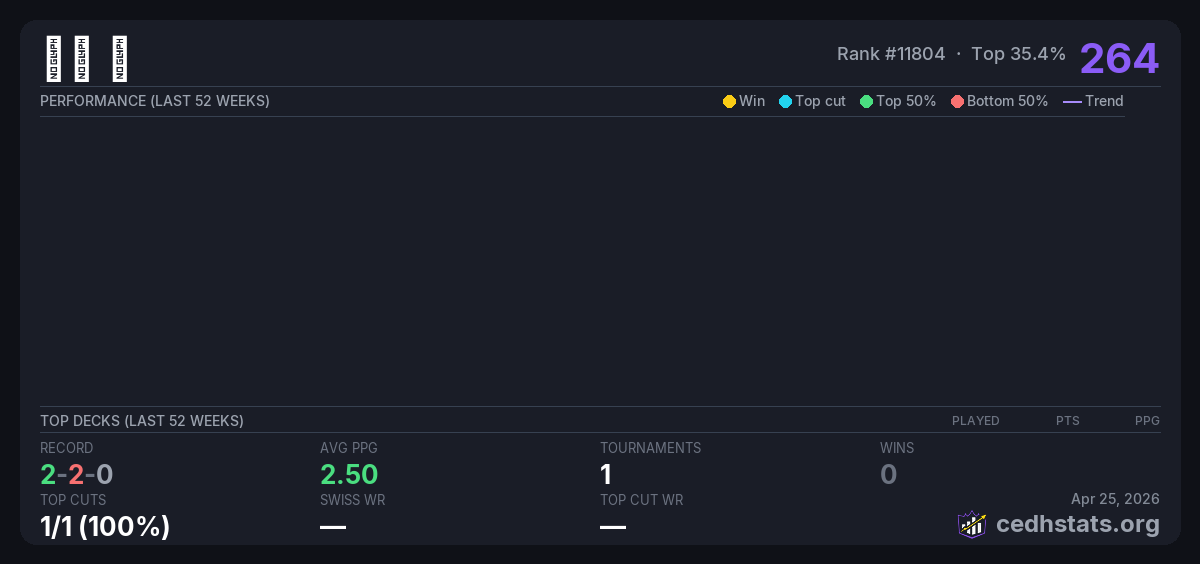 | 9月14日 CEDH月赛 Sep 14, 2025 · 24 players | Invalid pairing | 3/24 | 2-2-0 | 2.50 | 264 |