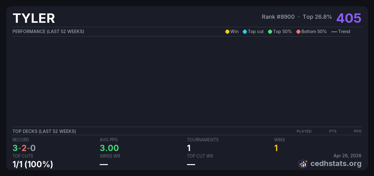 | VOID CHRIS May 30, 2025 · 16 players | Invalid pairing | 1/16 | 3-2-0 | 3.00 | 405 |