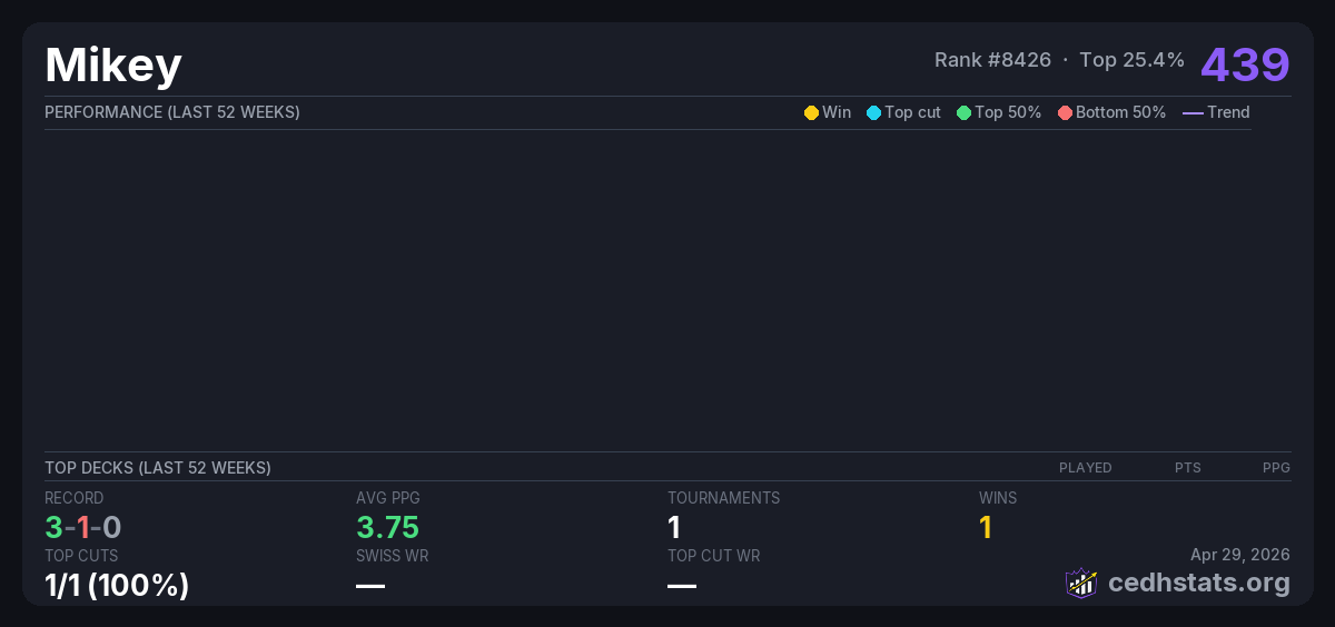 | Tournament | Deck | Result | Record | PPG | Points ? |